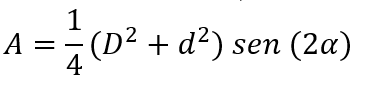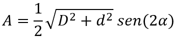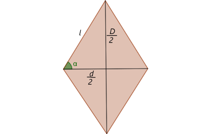 donde D y d son las diagonales mayor y menor respectivamente del rombo y α es el ángulo de la bisectriz de la diagonal menor.