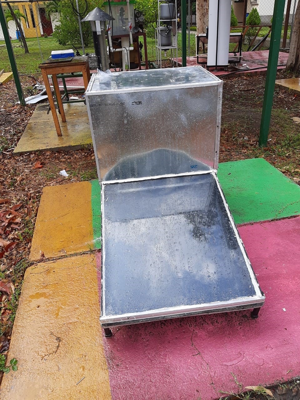 La cámara tiene en la parte inferior una abertura donde se conecta el calentador solar y una puerta que permite introducir y sacar las bandejas, pero lo suficientemente segura de modo que evita la entrada de insectos.