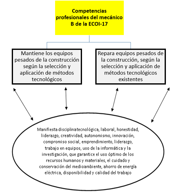 Según el concepto asumido con anterioridad, la competencia profesional constituye una cualidad que se debe formar en los mecánicos B de la ECOI-17 desde un enfoque social humano, en la que expresa la integración de saberes (ser: conocimientos, hacer: habilidades, convivir y estar: normas de comportamiento social y ser: valores morales, ambientales, profesionales, liderazgo, emprendimiento, trabajo en equipos, uso de la investigación y la informática) mediante su desempeño profesional en la diversidad de puestos de trabajo asociados a los procesos de mantenimiento y reparación de equipos pesados de la construcción.