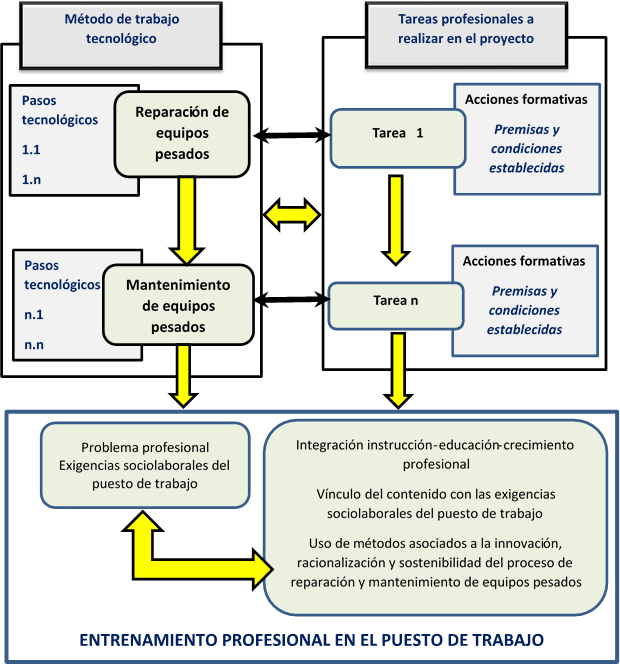 Las tareas profesionales deberán sistematizar la regularidad método de trabajo tecnológico de mantenimiento y reparación de equipos pesados de la construcción – método de aprendizaje profesional, tal y como se muestra en la figura: