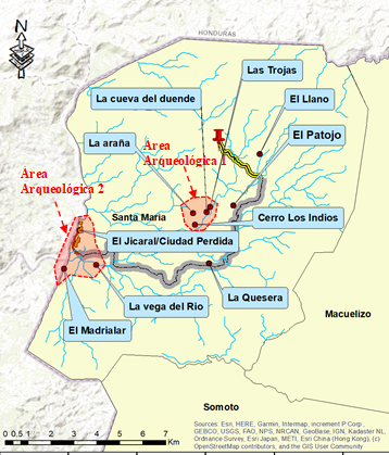 Imagen 2. Sitios arqueológicos documentados en el municipio de Santa María, Nueva Segovia. En color rojo, las áreas arqueológicas definidas. Fuente: CADI, 2022.