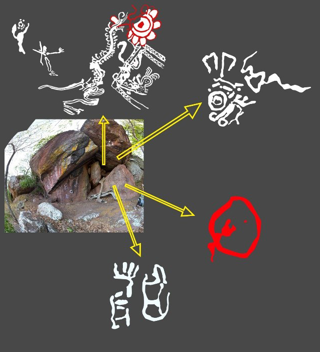 Imagen 3. Sitio Cueva del Duende. Abrigo rocoso con diversas representaciones antropomorfas, fitomorfas y abstractas. Fuente: CADI, 2021.