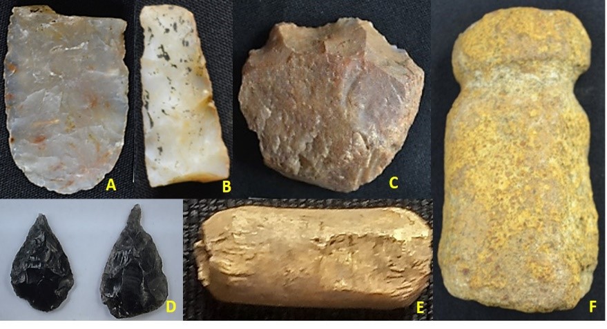 Imagen 5. Herramientas en piedra. A y B: puntas de lanzas; C: raedera; D: puntas de flechas; E: cuenta de collar en hueso y F: Pesa de redes de pescar. Fuente: CADI: 2021.