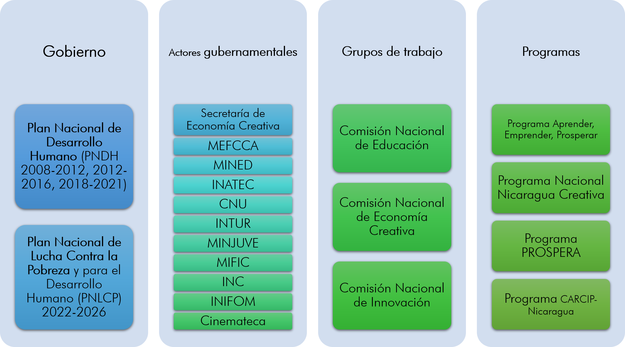 La operativización de la estrategia, rescata el papel activo del estado como líder y encausador del progreso, visto desde la creación de superestructuras y estructuras como lo desarrolla la teoría de Marx. En primera instancia, la creación de los nuevos actores gubernamentales como el Ministerio de Economía Familiar, Comunitaria, Cooperativa y Asociativa (MEFCCA), y, la Secretaría de Economía Creativa y Naranja adscrita a la Presidencia de la República. Que de manera conjunta han dirigido el trabajo con los actores ya existentes como: Ministerio de Educación (MINED), INATEC, Consejo Nacional de Universidades (CNU), Instituto de Turismo (INTUR), Ministerio de Fomento Industria y Comercio (MIFIC), Instituto Nicaragüense de Fomento Municipal (INIFOM), Ministerio de la Juventud (MINJUVE), Instituto Nacional de Cultura (INC), y, Cinemateca Nacional. (ver ilustración 1)