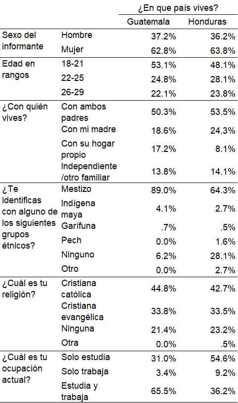 En relación con el universo y muestra, al ser una muestra a conveniencia no partió de un marco muestral ni universo definido, por lo que las unidades de selección no se eligieron de manera aleatoria ni representativa. Los resultados se circunscriben a la situación de las y los jóvenes que respondieron la encuesta. A pesar de esta limitante, los resultados buscan dar luces acerca de los posibles desafíos y principales características de las y los jóvenes universitarios en el contexto de lo glocal. En total participaron 330 jóvenes de los cuales 185 eran de Honduras y 145 de Guatemala, ambos casos de universidades públicas.