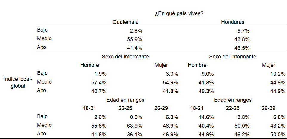 El Índice local-global, considerado como la capacidad de conocer e interactuar con el mundo, es un índice de nivel medio-alto en ambos lugares. El estar informado del acontecer mundial, es importante para conocer la realidad, en Guatemala el 55.9% de jóvenes tienen nivel medio, doce puntos porcentuales por arriba comparado con sus pares hondureños. En el nivel alto, Honduras presenta 46.5%, cinco puntos porcentuales por arriba que sus pares guatemaltecos. Sin embargo, en el nivel bajo, hay un considerable 9.7% de jóvenes que no les interesa conocer lo que ocurre en el mundo, tres veces más que lo reportado en Guatemala (Tabla 4).