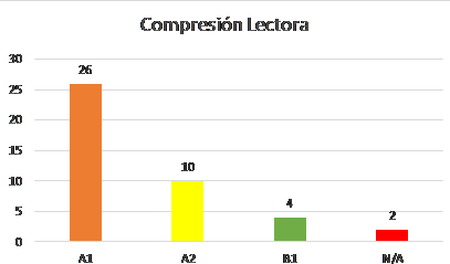 Se puede observar según el gráfico que 26 participantes (62%) de 42 mostraron, de acuerdo con el descriptor MCER (2002), la capacidad lingüística de comprender textos muy breves y sencillos, leer frase por frase y captar frases muy básicas. No obstante, existen 14 participantes que mostraron haber alcanzado un nivel de dominio entre A2 y B1, lo cual indica que (MCER, 2002) ellos tienen la capacidad de leer textos sencillos sobre hechos concretos con un nivel de comprensión satisfactorio.