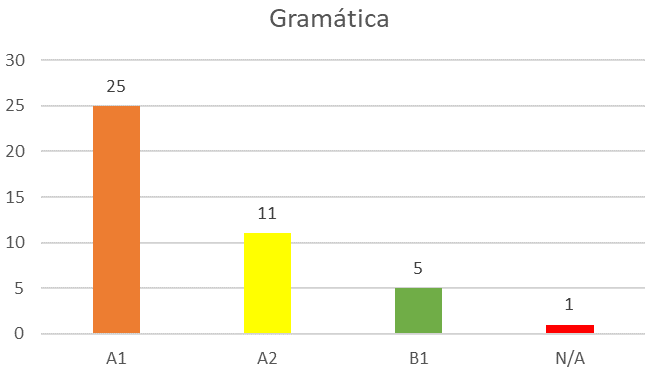Según datos, se puede apreciar que 25 participantes (59.5%), según MCER (2002) conocen estructuras gramaticales bastante sencillas. 11 de ellos tienen la capacidad de utilizar estructuras sencillas con cierta concordancia. 5 de los participantes tienen la capacidad de utilizar un buen repertorio de estructuras gramaticales con razonable corrección.