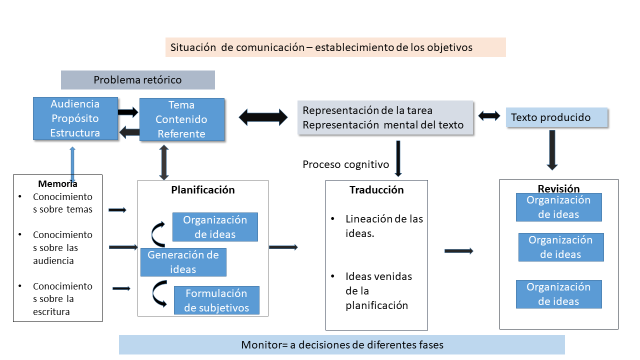 Según Macchi y Veinberg (2005) la escritura es un proceso con tres pasos: organización de ideas, la redacción del texto y la revisión y corrección. Para Cassany, luna y Sanz (2003, p. 258) el buen escritor es el que posee capacidad para comunicarse correctamente, al producir textos claros de una extensión considerable. Para Flower y Hayes son pioneros del enfoque procesual, la generación textual, se resume en tres etapas: planificación, traducción y revisión. A continuación, su propuesta.
