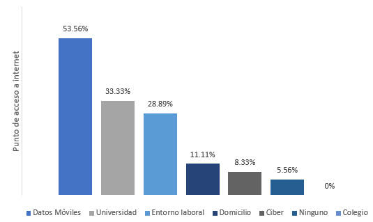 Se logró identificar que la mayoría de los aprendientes acceden a Internet mediante datos móviles, ya sea por los servicios ofrecidos por las compañías telefónicas de Claro o Tigo. Seguido por el punto de acceso brindado por las universidades, en menor medida están los accesos en entornos laborales, domicilios y ciber. Cabe señalar que, hay quienes afirman no tener forma de acceder al Internet; sin embargo, lo más impactante es que los colegios no garantizan el acceso de Internet a los aprendientes (Figura 3).