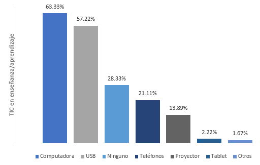 En el entorno de enseñanza/aprendizaje la computadora es la herramienta más utilizada por los facilitadores, seguido por la USB, teléfonos, proyectores y tables respectivamente (Figura 4). Lo alarmante es la gran cantidad de aprendientes que afirman que, durante el desarrollo de las clases no se usa ningún tipo de TIC. Esto es una indicación clara de la brecha digital en la que se encuentra el sistema educativo de esta región; por otra parte, en ningún momento se señaló el uso del Internet dentro de las aulas.