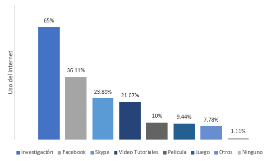 La utilidad del Internet es amplia, se esperaría que los aprendientes le den un uso más enfocado a la recreación; sin embargo, los resultados reflejaron que el uso más común entre los aprendientes es la investigación; esto es un buen indicador, indicando que esta tecnología se está usando para nutrir los conocimientos. Supone una contribución positiva al proceso de transformación educativa. En segundo lugar, está el uso de la red social de Facebook, en menor cantidad está el uso de Skype, tutoriales y juegos (Figura 5).