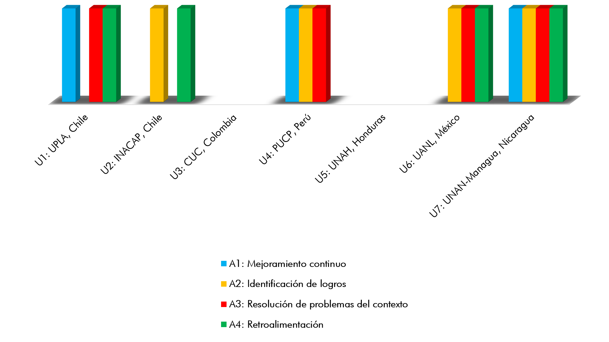 La U3 y U5 no consideran los indicadores de la evaluación de competencias. La U1, U4, U6 y U7 son las que evidencian más indicadores de la evaluación de competencias, al considerar tres y cuatro respectivamente. Sin embargo, estas tienen sus diferencias: para el aspecto mejoramiento continuo solo tres universidades lo retoman, en el caso de los elementos identificación de logros, resolución de problemas del contexto y retroalimentación, son señalados por cuatro universidades.