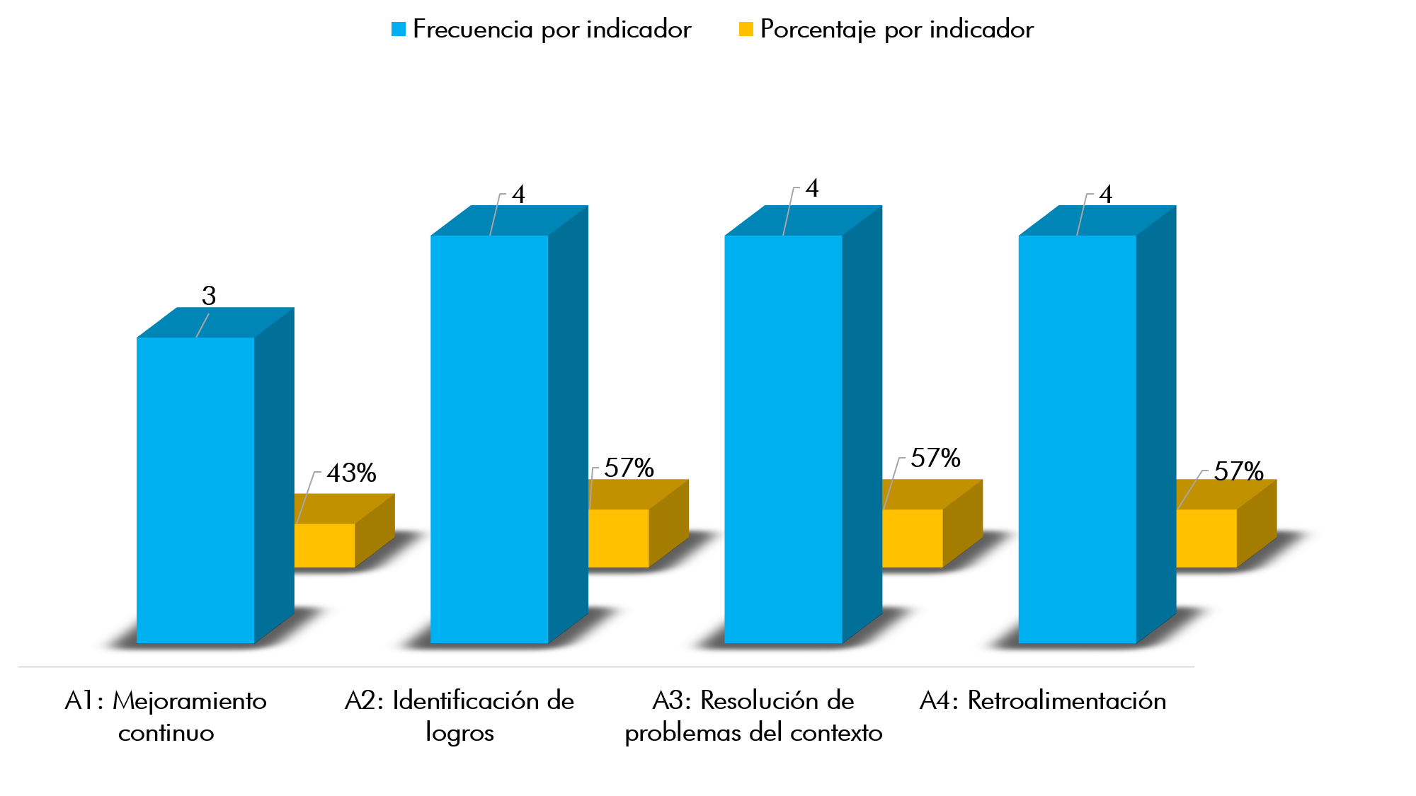 La figura No.2. muestra que, para los indicadores identificación de logros, resolución de problemas del contexto y retroalimentación, cuatro universidades los señalan como parte de la evaluación de competencias, esto representa el 57% de las siete universidades estudiadas, seguidamente el aspecto mejoramiento continuo, en el que tres universidades lo mencionan en la evaluación, esto corresponde al 43% de las universidades examinadas.
