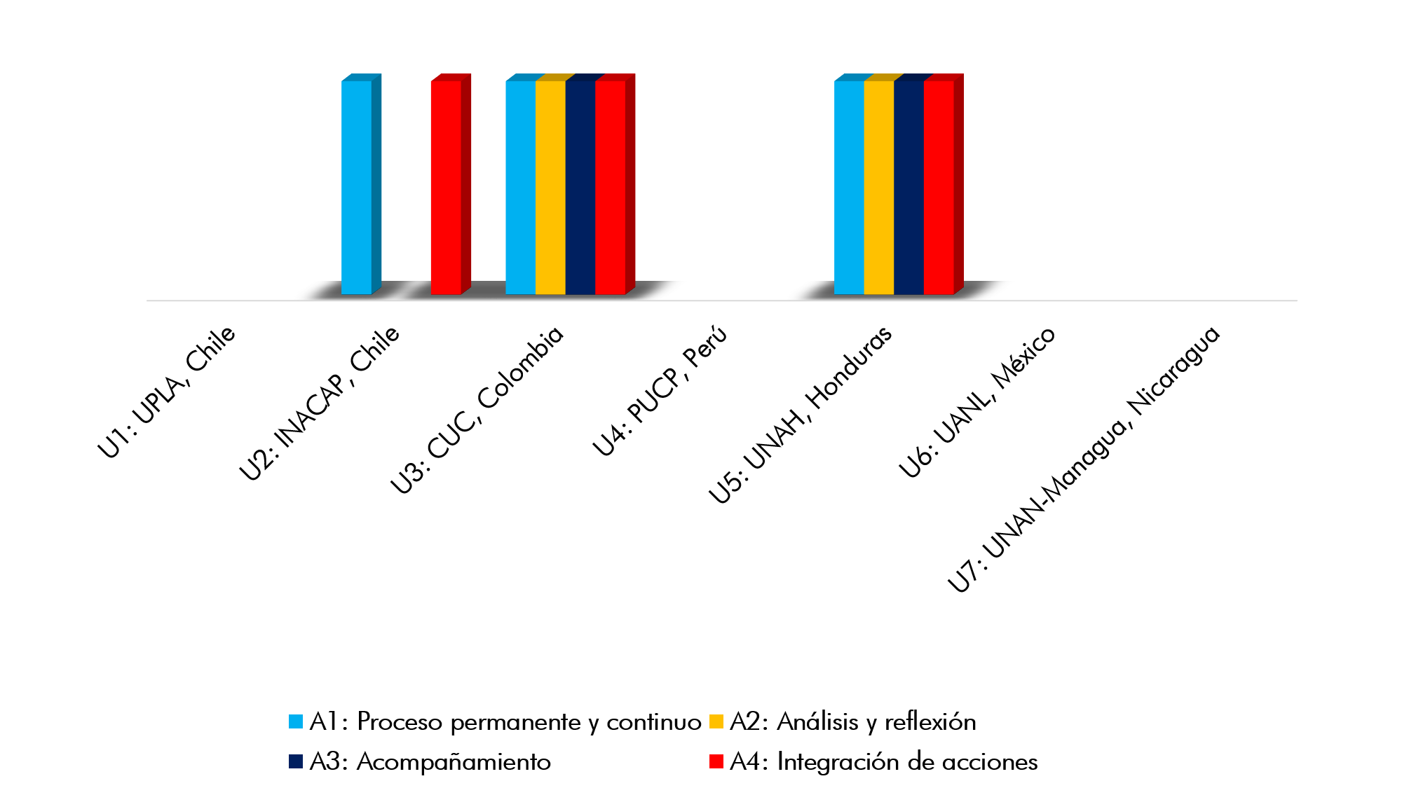 La U1, U4, U6 y U7 no consideran los indicadores de la evaluación de los aprendizajes como parte del proceso, sin embargo, son retomados por las otras tres universidades. La U3 y U5 asumen la evaluación de los aprendizajes como un elemento importante en este modelo. Con respecto a la U2, esta retoma el proceso permanente y continuo e integración de acciones, como indicadores esenciales.
