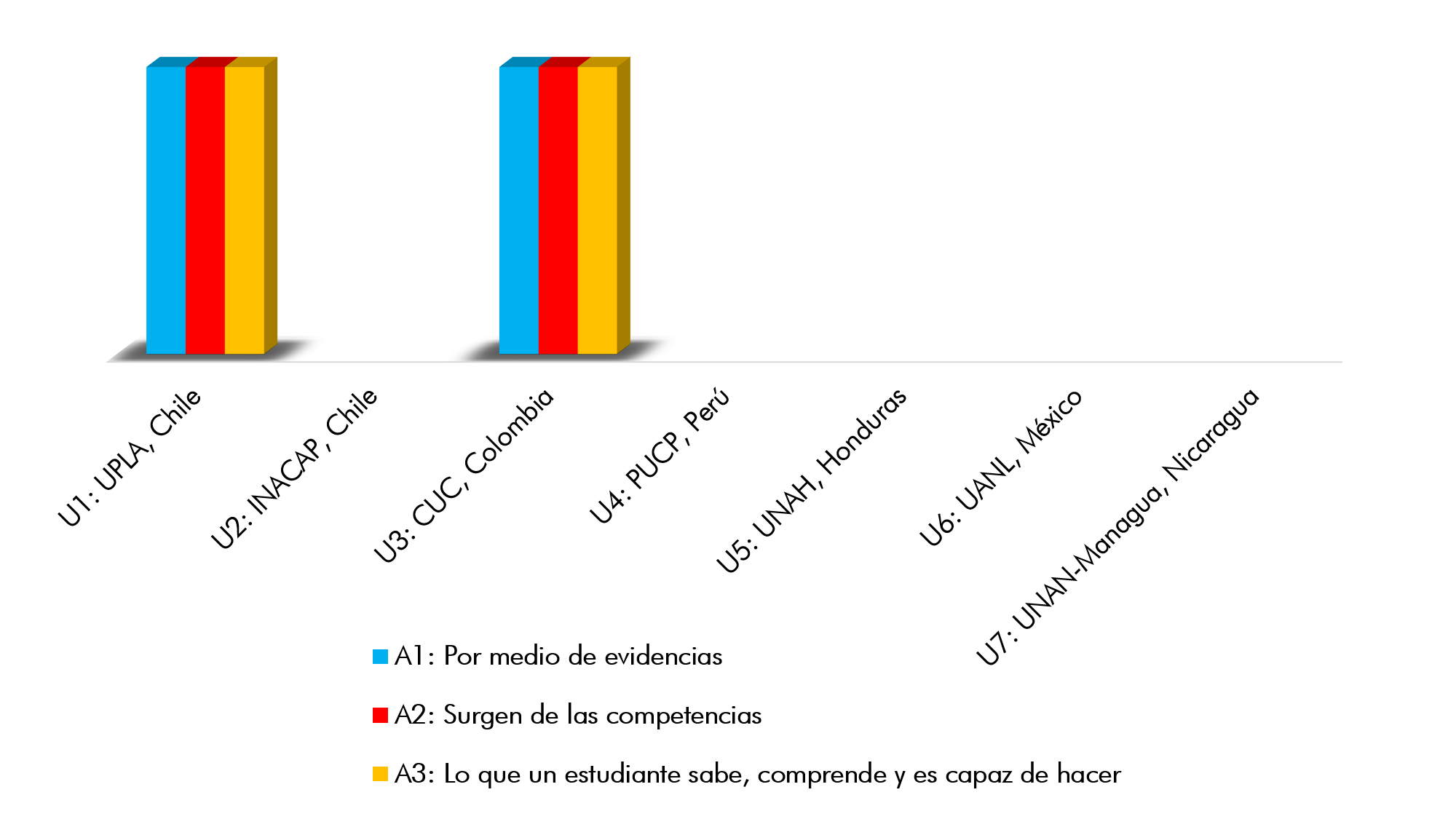 Los datos proporcionados desde el análisis documental concernientes a la evaluación de los aprendizajes de los estudiantes, que ponen en práctica las siete universidades latinoamericanas, indican la evaluación de competencia, le continúa la evaluación de aprendizaje y en menor grado de coincidencia los resultados de aprendizaje.