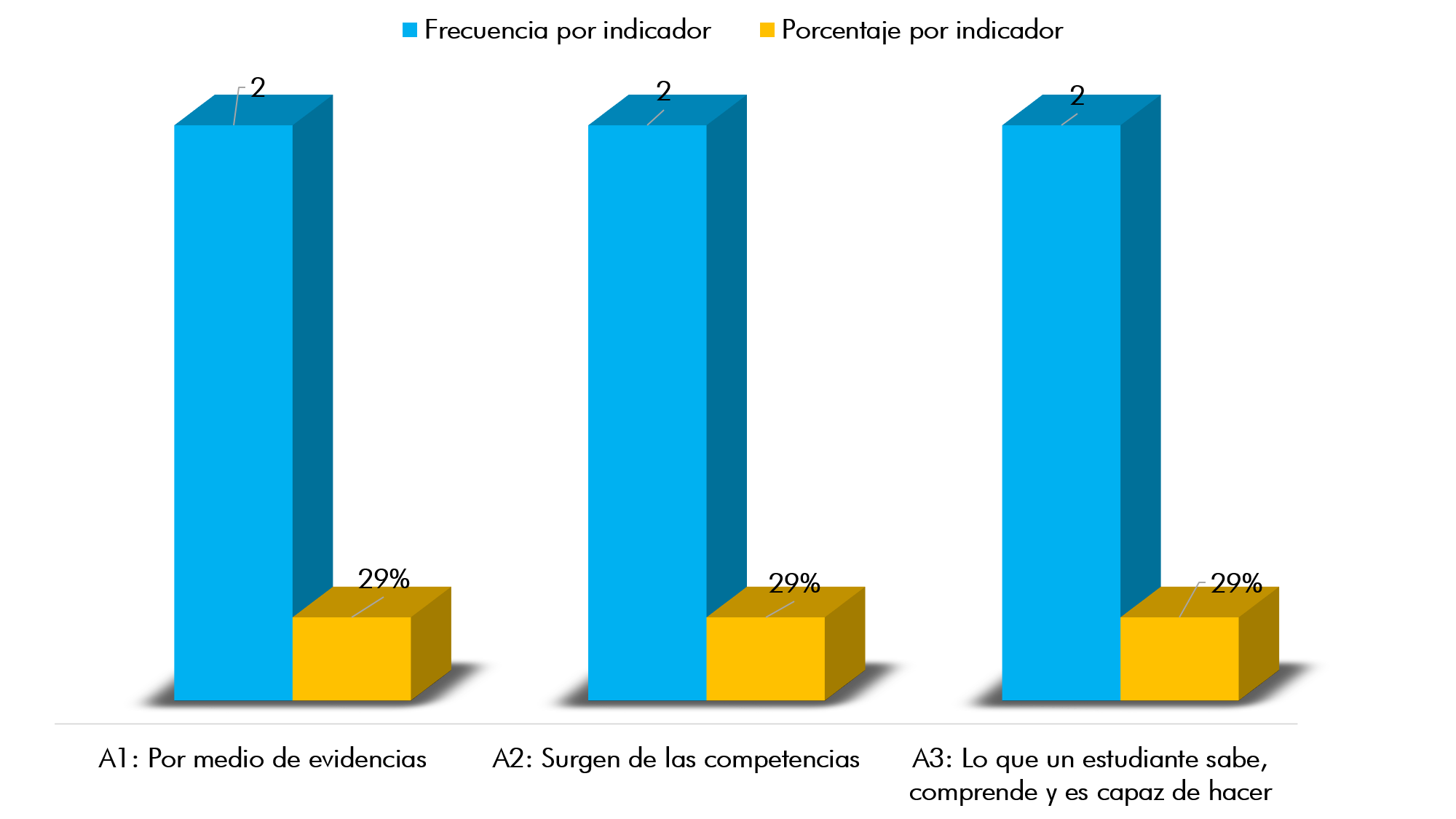 La figura muestra que los indicadores por medio de evidencias surgen de las competencias y lo que un estudiante sabe, comprende y es capaz de hacer. Dos universidades lo señalan como parte de los resultados de aprendizaje. Esto representa el 29% de las siete universidades estudiadas.