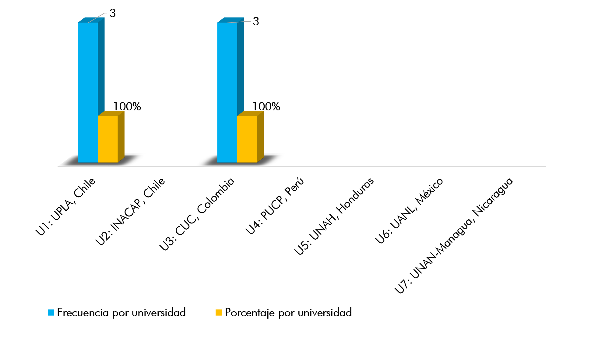 En la figura se refleja la cantidad de indicadores asumidos por las universidades estudiadas. La U1 y U3 retoman tres, lo que corresponde al 100%. La U2, U4, U5, U6 y U7 no consideran los aspectos en los resultados de aprendizaje como parte del proceso.