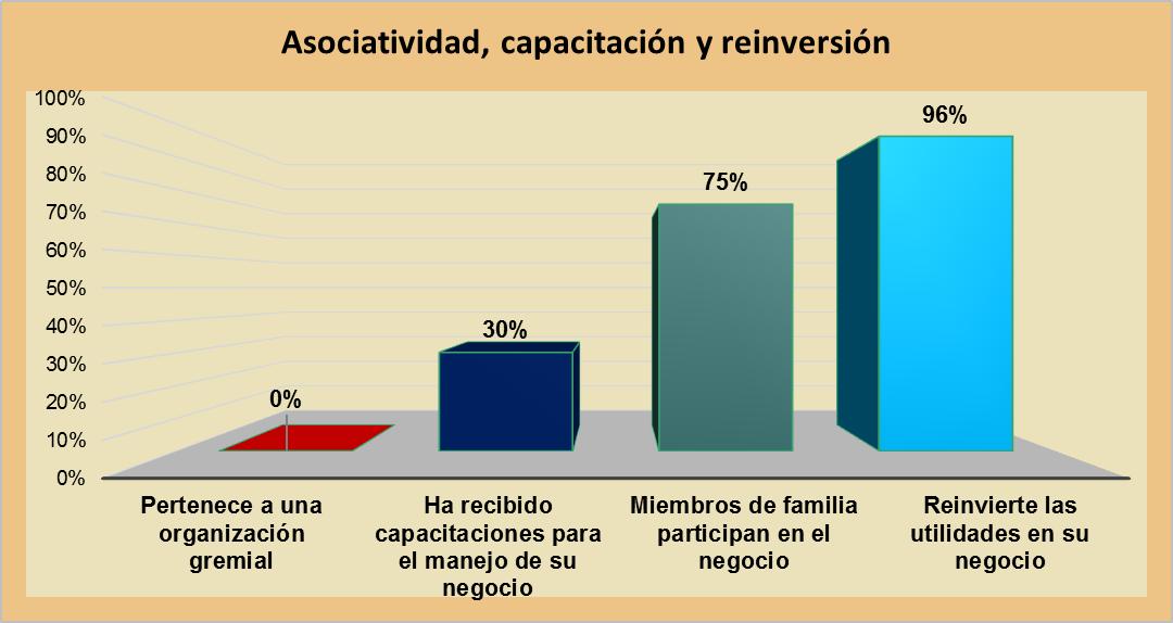 Relativamente no tienen muchos años de experiencia, la mitad de los propietarios no superan los 10 años en comercio, por lo que se requiere fortalecer algunos aspectos, entre estos, la asociatividad gremial, que les permita de manera conjunta realizar cambios, mejoras o desarrollos tecnológicos que mejore su competitividad, adicionalmente presentan un alto grado de debilidad en capacitación, lo cual es una limitante tanto en adoptar una visión estratégica, como en la apropiación de herramientas gerenciales que contribuya a una visión empresarial más amplia y analítica de su entorno competitivo.