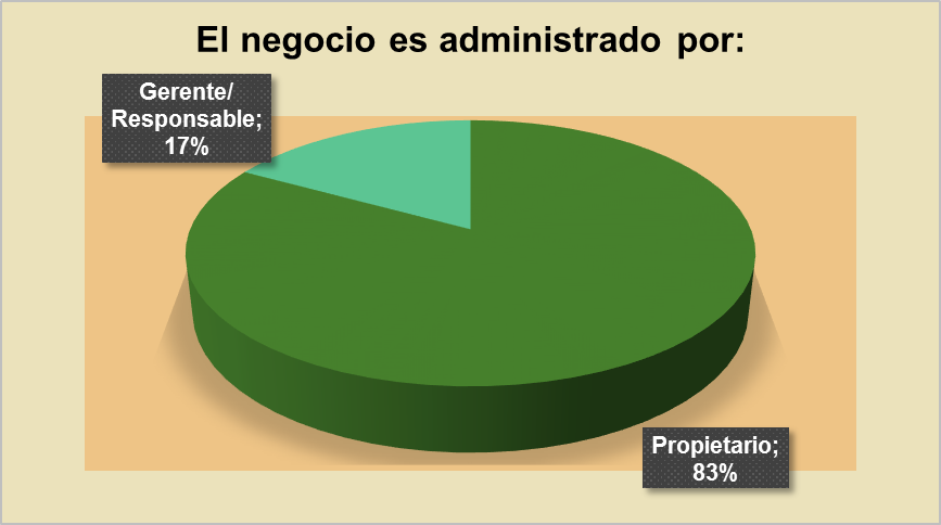 En la caracterización socioeconómica de los propietarios/gerentes, los resultados indican que la mayoría están administrados por los propietarios, siendo jóvenes entre los 18 y 40 años, lo que posibilita el crecimiento y desarrollo empresarial de este segmento, con predominio del sexo femenino lo que denota el incremento de la participación de la mujer en la gestión empresarial. La mitad de esos empresarios tiene nivel de educación superior siendo esto una fortaleza ya que cuentan con herramientas científicas metodológicas que les facilitaría la comprensión e implementación de estrategias o modelos para mejorar la gestión comercial de su negocio; así mismo los datos indican que tienen responsabilidad familiar ya que tienen de 1-3 personas que dependen de ellos.