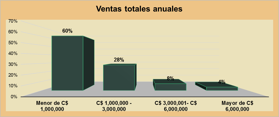 Según el gráfico n°3, las ventas anuales de más de la mitad de estos negocios (60%), son inferiores a C$ 1,000,000 y un 28% tienen ventas anuales en el rango de C$1,000,000-C$3,000,000. Solamente un 12% de las tiendas tienen ventas por encima de C$3,000,000.