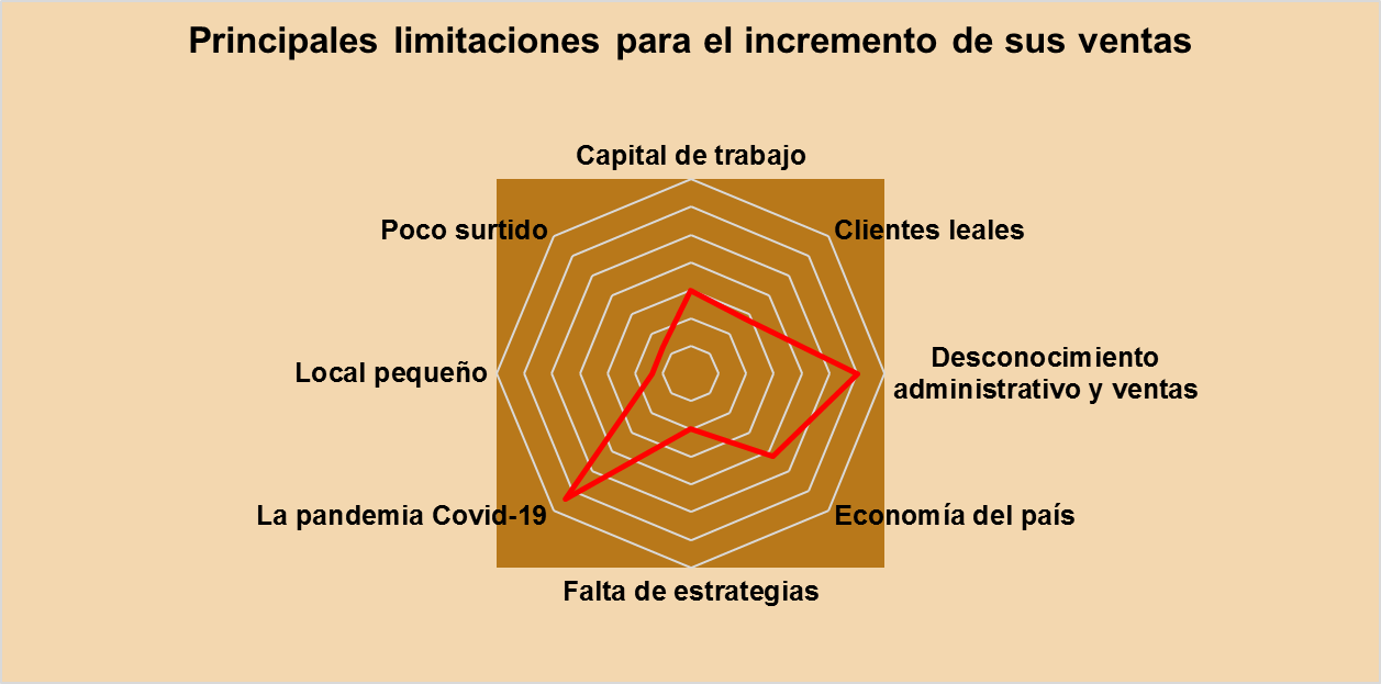 Las limitaciones que han tenido para el incremento de las ventas por orden de importancia están: la pandemia, el desconocimiento administrativo y de ventas, la economía del país, capital de trabajo y la falta de clientes leales, esto indica la necesidad de fortalecer la gestión empresarial que les permita un mejor posicionamiento en el mercado y por ende mayor competitividad.
