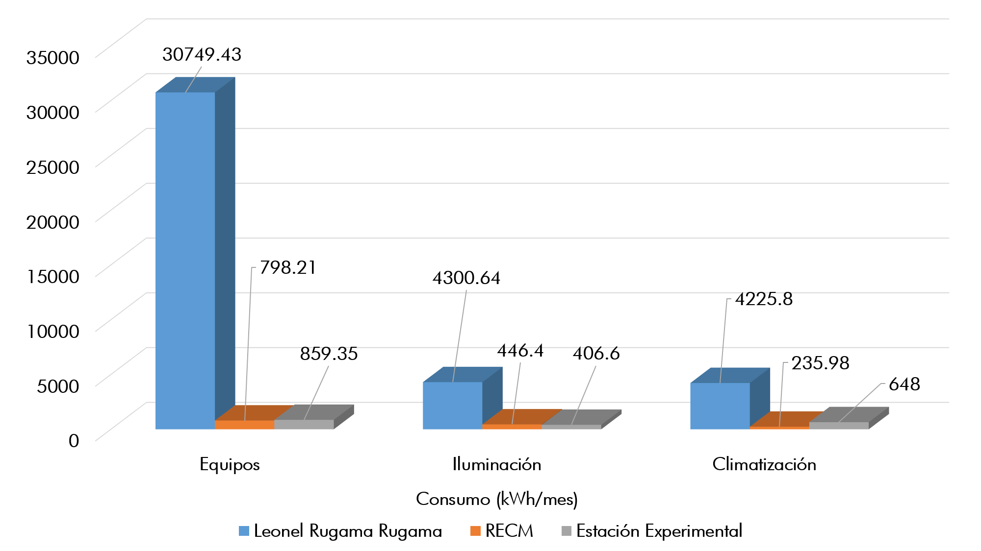 De manera global, se encontró que, en los tres recintos, los equipos eléctricos son los mayores consumidores de energía (Figura 5).