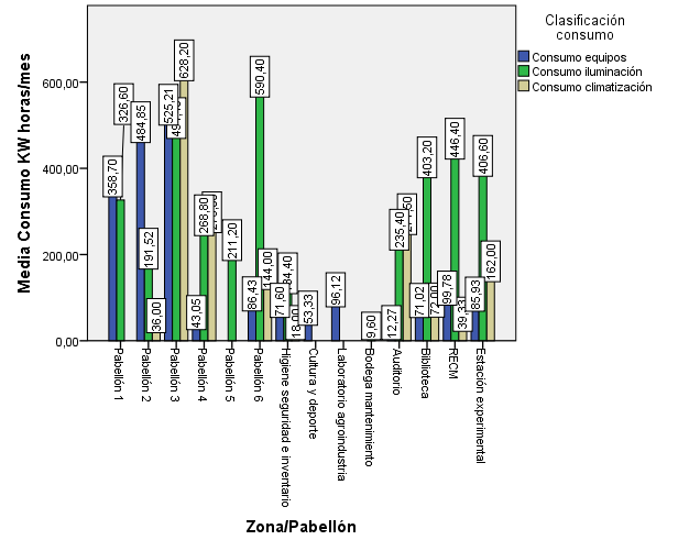 Figura 8. Consumo total de energía eléctrica por zonas o pabellones