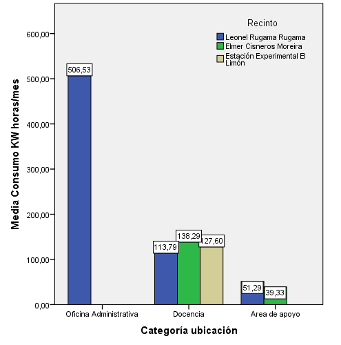 Se encontró que el área administrativa representa el mayor consumo de energía en el recinto Leonel Rugama Rugama, consumiendo 506.53 kWh/mes. En segundo lugar, se ubica el área de docencia del Recinto Elmer Cisneros Moreira con 138.29 kWh/mes y en tercer lugar, el área de docencia de la Estación Experimental El Limón, con 127.69 kWh/mes (Figura 7).