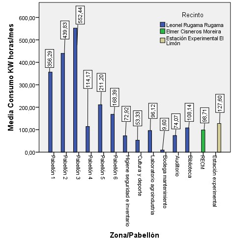 De manera global, al comparar las distintas áreas de los diferentes recintos, se encontró que los mayores consumos de energía se dan en el pabellón 3 del recinto Leonel Rugama Rugama con 552.44 kWh/mes, seguido del pabellón 2 con 439.83 kWh/mes y del pabellón 1 con 356.29 kWh/mes (Figura 8).