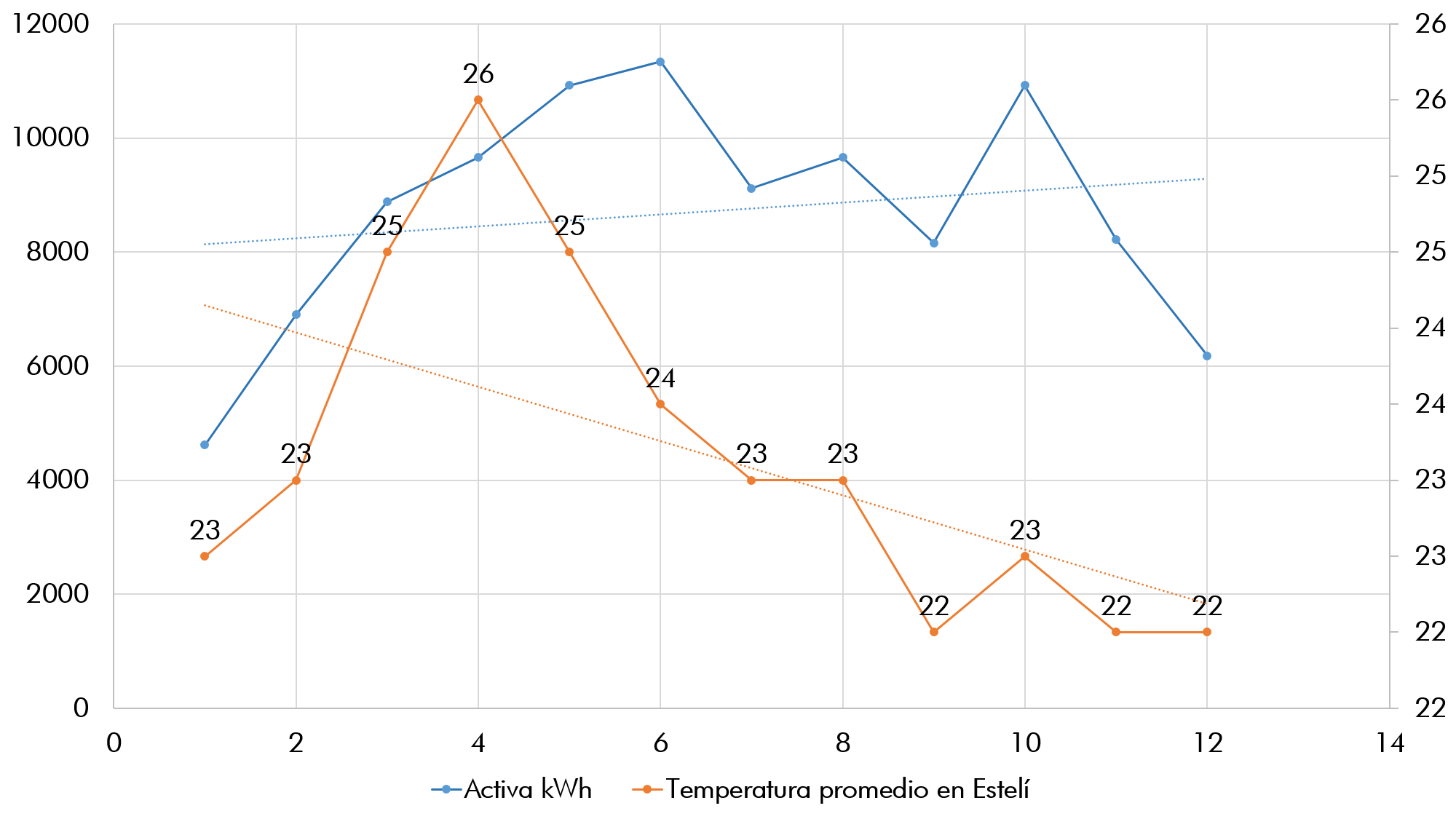 Por otra parte, se establecieron relaciones entre el consumo de energía eléctrica y la temperatura promedio mensual en la ciudad de Estelí, considerando que este parámetro tiene una estrecha relación con el uso de ventiladores y aire acondicionado (Figura 9).