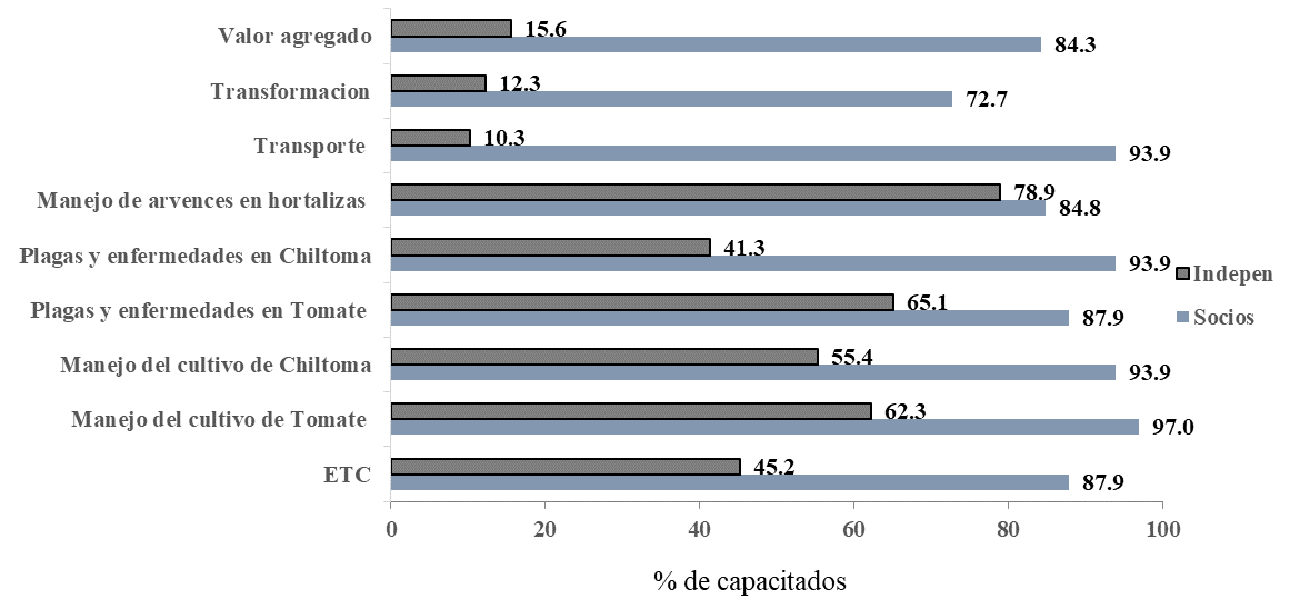 Nota: el gráfico representa el porcentaje tanto de socios como de productores individuales que se han capacitado en los diferentes temas de manejo del cultivo de tomate y chiltoma.