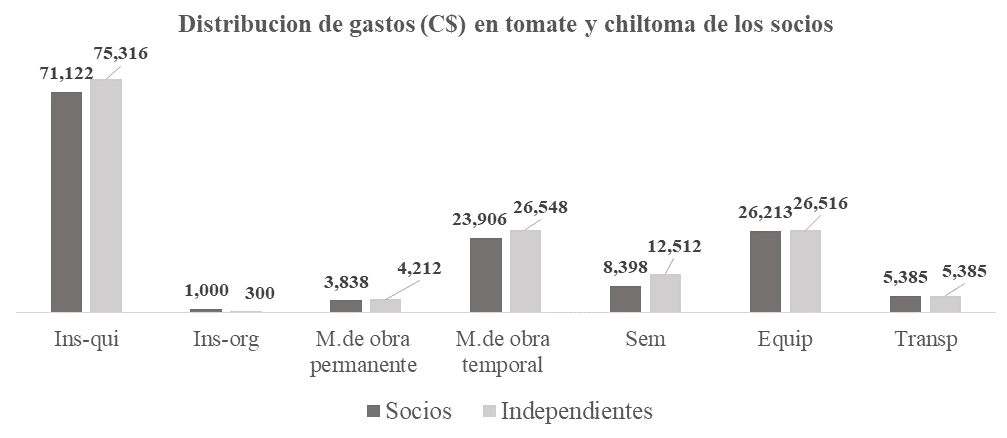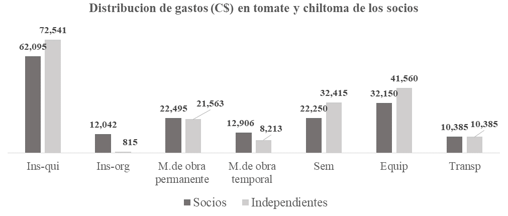 De acuerdo al gasto generado para la producción de 1 mz de chiltoma, este presenta un promedio de gastos de 139,952 córdobas o el equivalente a ($, 3,887.55 dólares), a pesar de ello tanto asociados como independientes gastan aproximadamente el entre el 50 y el 53% de la inversión en productos e insumos sintéticos, cabe mencionar que los productores independientes presentan un costo de inversión del 7.73% mayor que los asociados, esto es debido a realizar más inversiones en insumos químicos, mano de obras y compras de semillas.