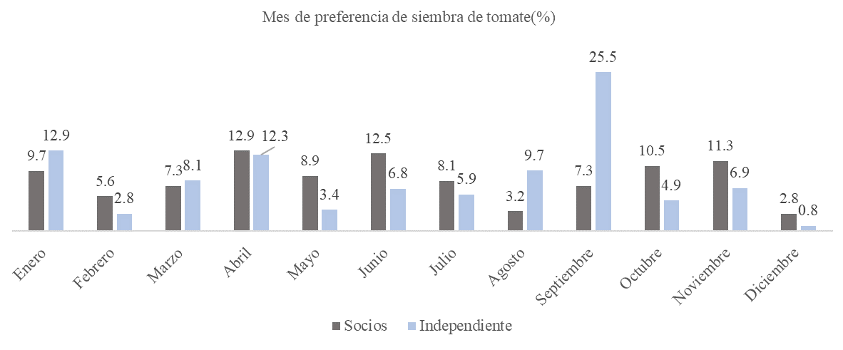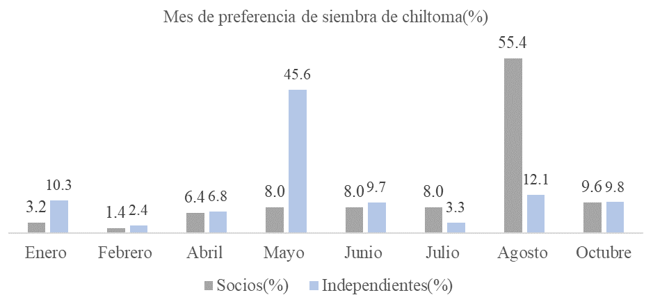 En el caso de los productores independientes, prefieren establecer más en el mes de enero, abril y en el mes de Septiembre. Los productores independientes prefieren establecer la chiltoma en los meses de enero y mayo y en el caso de los asociados tienen preferencia entre el mes de Julio y agosto.