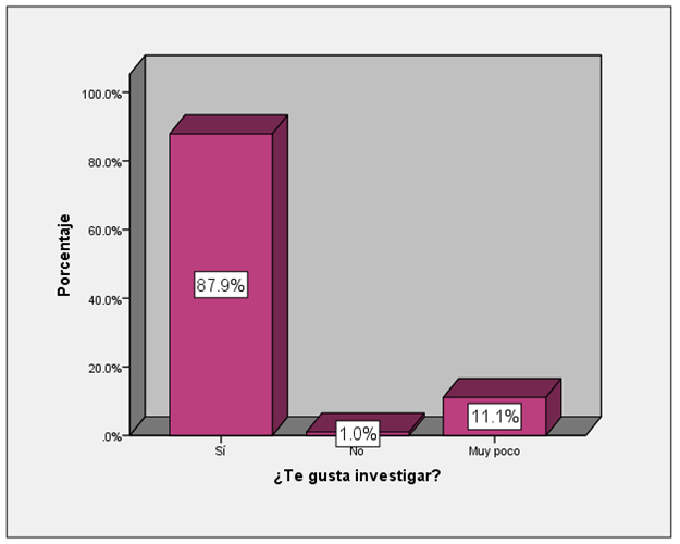 En la figura 1, es importante darse cuenta como los estudiantes de FAREM-Matagalpa manifiestan su interés por investigar. Esto se refleja a través de la encuesta aplicada a los diferentes grupos y carreras donde el 88% afirma que le gusta investigar, el 11% asegura que muy poco y el 1% definitivamente no les gusta investigar.