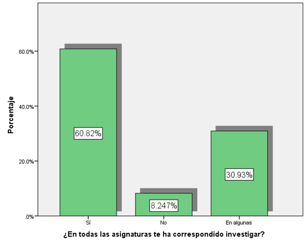 Cabe señalar que esto es una percepción de los estudiantes, pero que hoy en día en este modelo por competencias con el que se está trabajando en la universidad, todos los docentes promueven la investigación en sus componentes curriculares que están sirviendo.