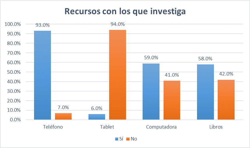 Según la figura 3, el 93% de los estudiantes encuestados hacen uso del teléfono, un 59% de los estudiantes encuestados tienen una computadora personal o familiar, el 6% utiliza su tablet, y el 58% investiga haciendo uso de libros de textos impresos o digitales.