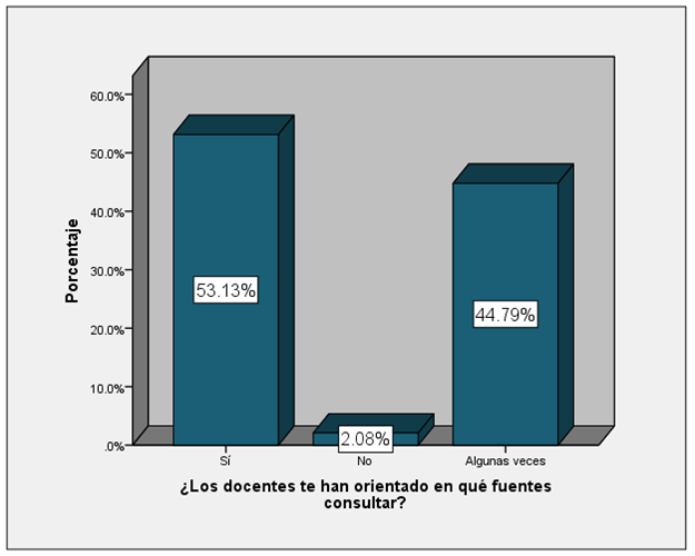 Según la figura 7, el 53% de estudiantes afirma que son orientados por los docentes para los sitos donde pueden buscar bibliografía, un 45% asegura que algunas veces tienen orientación de los docentes sobre las fuentes donde pueden buscar información bibliográfica, y al final, un 2% expresa no ser orientados en la búsqueda de la bibliografía.