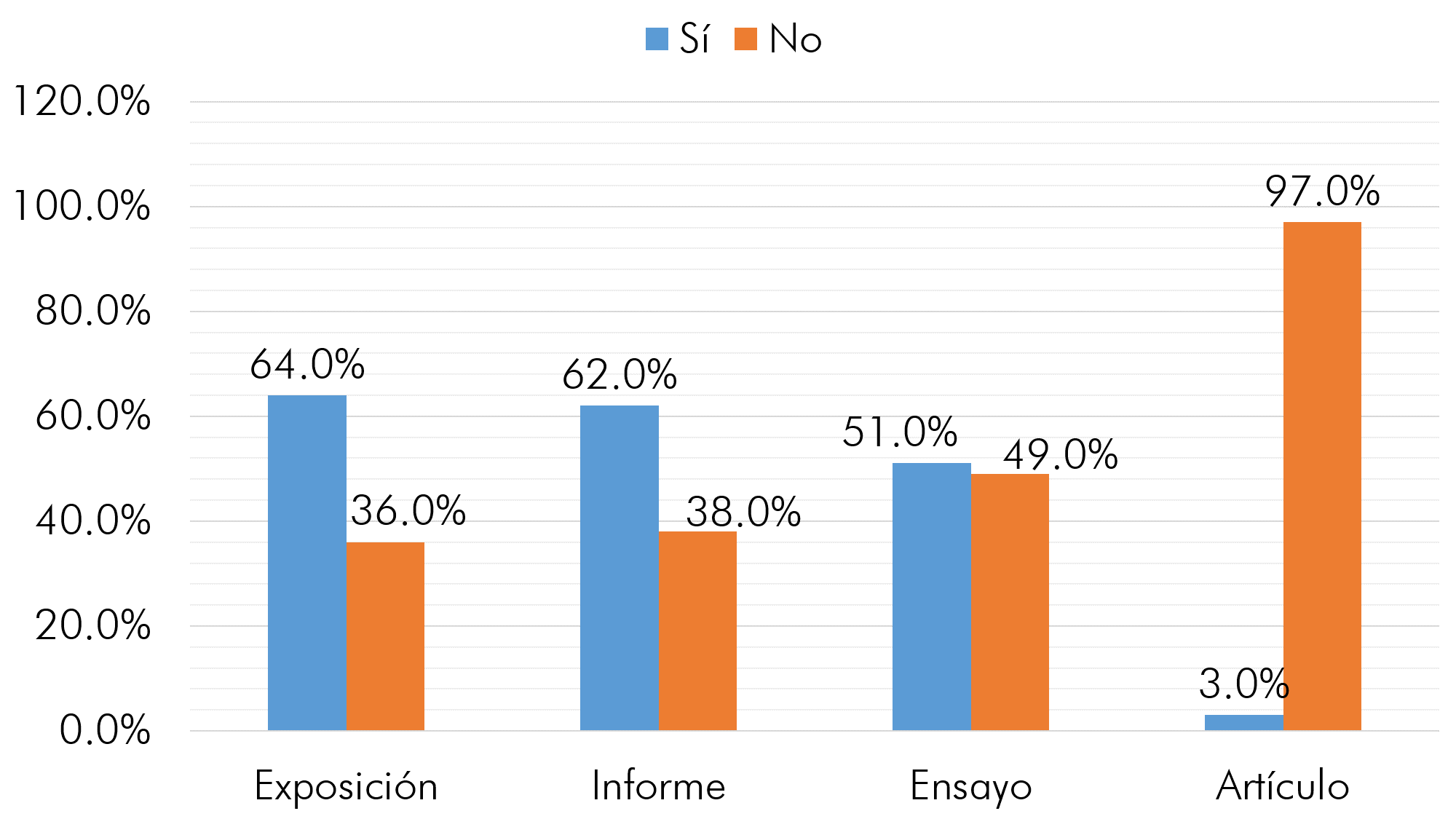 El producto que elaboran al final de la realización de una investigación, puede ser un ensayo, exposición, informe, entre otros. Según la figura 7, el 64% afirma que lo hacen para realizar exposiciones, un 62% han sido orientados a la realización de un informe de investigación, un 51% han investigado para realizar un ensayo y solo un 3% ha investigado para la elaboración de un artículo científico.