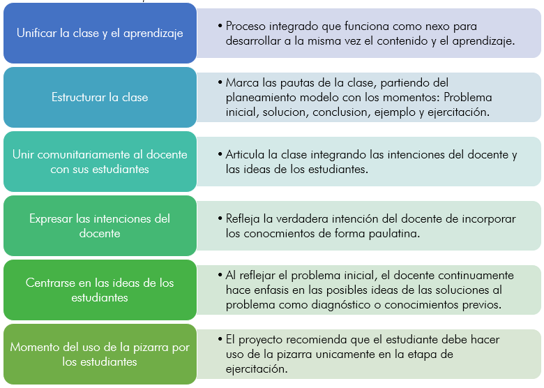 El modelo del plan pizarra en matemáticas desde su estructura constituye una importante metodología continua de pasos que son congruentes a los momentos del planeamiento didáctico (actividades iniciales, desarrollo, culminación y evaluación), que se desarrollan en el aula de clases en un periodo de 45 minutos usando como su nombre lo dice la pizarra donde MINED (2019a), lo define como: