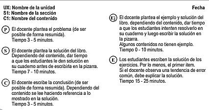 Cada aspecto del plan de pizarra está dentro de las actividades del planeamiento que se maneja con las demás asignaturas en los que se pueden agrupar dentro de las actividades iniciales está el problema inicial (P)¸ en las actividades de desarrollo está la solución(S), conclusión(C) y ejemplo (Ej), en las finales esta la ejercitación(E); en las de evaluación es involucrar todo el proceso formativo del desarrollo de la clase y que los estudiantes resuelvan en su cuaderno primeramente los ejercicios planteados; luego exponga en la pizarra la solución final. Cabe señalar, que deben de tomarse en cuenta el tiempo sugerido, pero esto no implica que siempre será la misma distribución, estos dependerán de cada contenido y del docente, sin embargo, el modelo del plan de pizarra exige que se deben cumplir lo antes sugerido.