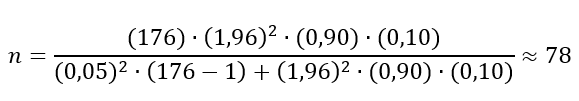 Donde N son los 176 estudiantes; es el nivel de confianza al 95% correspondiente al valor Z de 1,96; p es la probabilidad de éxito y q la probabilidad de fracaso y d error máximo admisible de 0,05, al realizar dicho cálculo se obtuvo una muestra aproximada de 78 estudiantes correspondiente al 44,3 % de la población. Tal como se demuestra el cálculo: