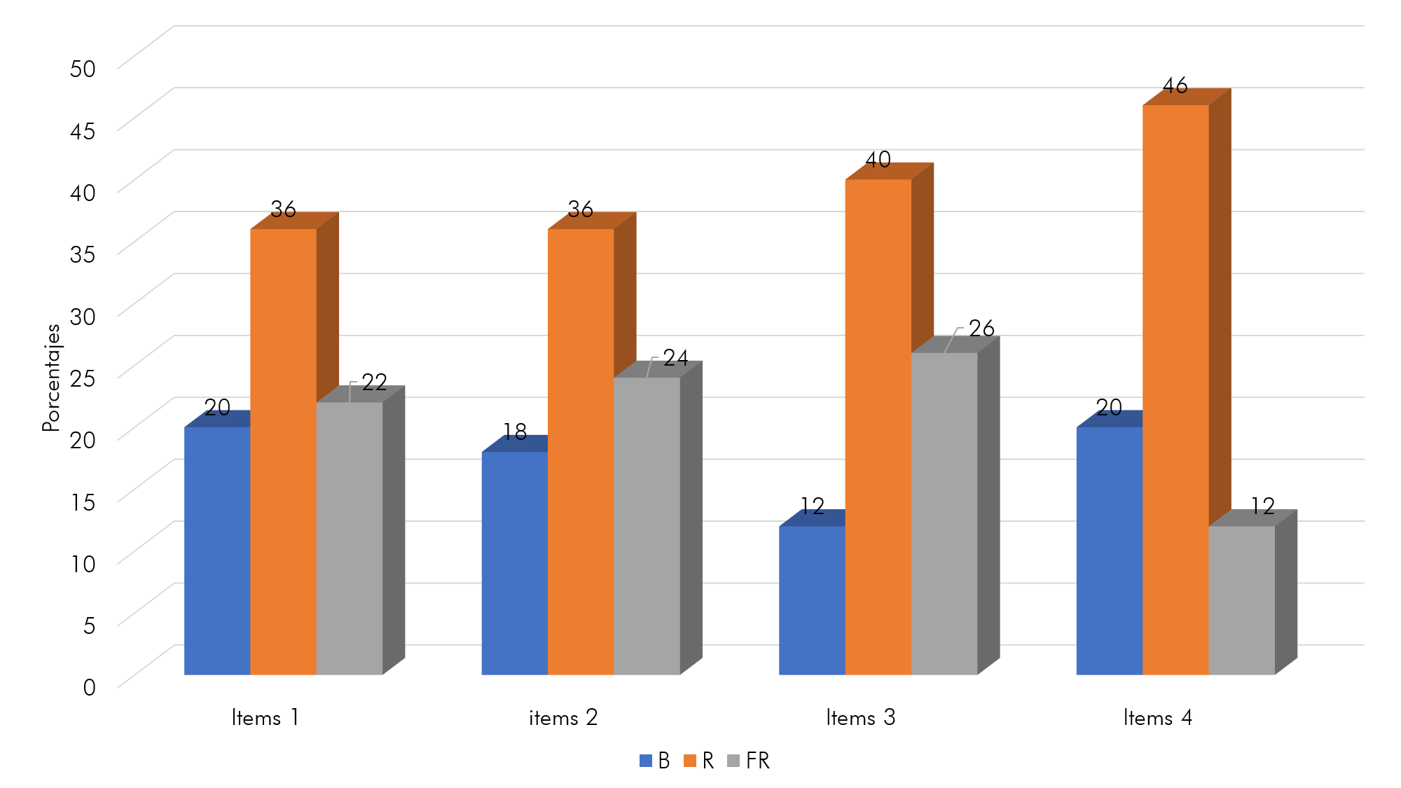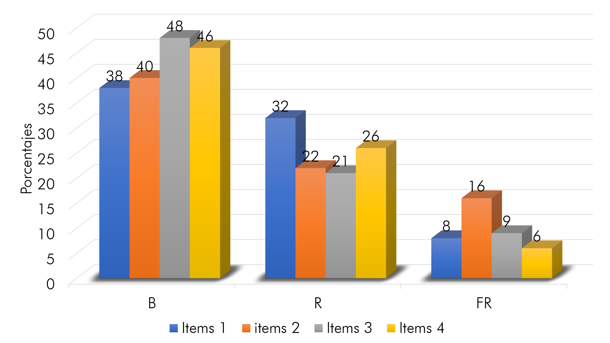 Para que se realizara un buen análisis la prueba de la fase 2, se estudió según la prueba 1 por ítems 1, 2, 3 y 4, como la prueba 2 se seccionó y se hizo 4 pruebas cortas las cuales se marcaron como ítems 1,2,3 y 4 para realizar el contraste. Al corregir las pruebas y obtener los resultados se colocaron escalas como B: Bueno, R: Regular y FR: Falta reafirmar.