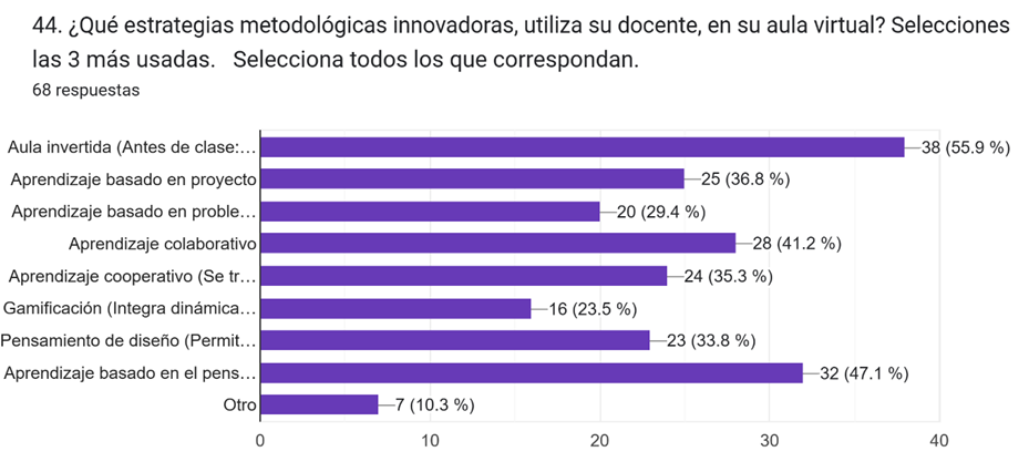 En el indicador 9.47 diseño instruccional ¿Qué estrategias metodológicas innovadoras, utiliza su docente, en su aula virtual? Selecciones las 3 más usadas. * Selecciona todos los que correspondan.