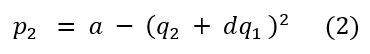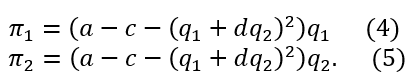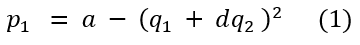 donde 𝑎 > 0 y 0 ≤ 𝑑 ≤ 1. El parámetro 𝑎 denota el tamaño del mercado y 𝑑 el grado de diferenciación de los productos producidos por ambas firmas. Nótese que si 𝑑 = 1, entonces ambas funciones de demanda son idénticas, es decir, los bienes son perfectamente sustitutos. Si 𝑑 = 0, entonces cada empresa se comporta como un monopolio. Además, al ser 𝑝1 y 𝑝2 polinomios de segundo grado en las cantidades del bien a producir por ambas empresas con coeficientes negativos salvo el tamaño del mercado, se tiene que las funciones de demanda son cóncavas.