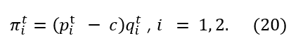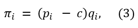 La función de beneficio 𝜋i𝑡 se interpreta de la siguiente manera: en un período de tiempo 𝑡∈ℕ cada empresa de forma simultánea elige la cantidad del bien a producir y por tanto queda determinado el precio de cada bien por las ecuaciones (1) y (2). Luego, 𝜋i𝑡 es el beneficio de la empresa 𝑖 en el período 𝑡.