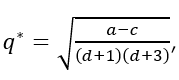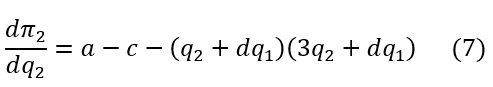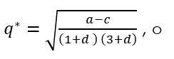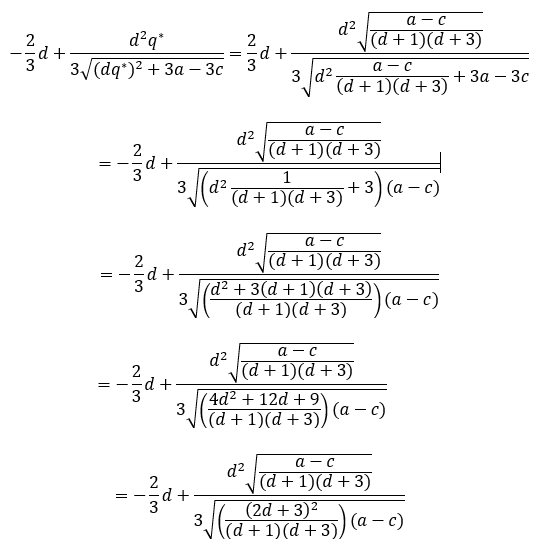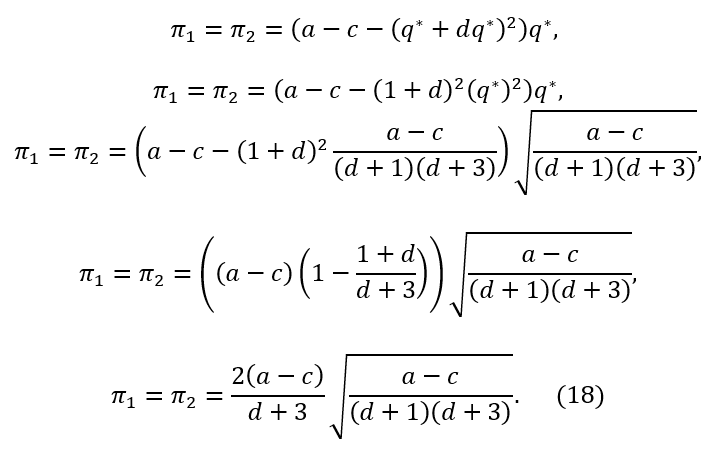 Observación: La expresión (19), que representa el beneficio de cada empresa en el equilibrio de Nash simétrico, es decreciente en 𝑑, lo cual significa que a mayor diferenciación (𝑑 → 0) mayor es el beneficio de cada firma. Además, sin importar los valores que tomen los parámetros (𝑎,𝑐 y 𝑑) cada empresa permanece en el mercado, es decir, produce su bien y tiene beneficio positivo. Otro hecho interesante es la estabilidad del equilibrio de Nash simétrico, lo cual es analizado a continuación.