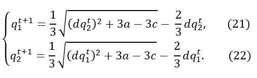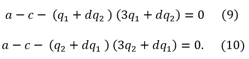 Bajo el supuesto de que ambas empresas actualizan su elección estratégica siguiendo la regla de expectativa ingenua, se tiene que 𝑞1𝑡+1=𝑞1 𝑡 y 𝑞2 𝑡+1=𝑞2 𝑡. Esto implica que el unico punto estacionario del sistema (21) - (22) resulta ser el punto de equilibrio de Nash. Por tal razón este sistema permite analizar el efecto del parámetro 𝑑 en la estabilidad del equilibrio de Nash.