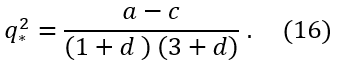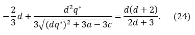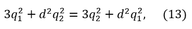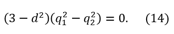De la ecuación (14) se sigue que 𝑞12−𝑞22=0, ya que el factor 3−𝑑2 es distinto de cero en virtud de la restricción 0≤𝑑≤1. Por tanto, 𝑞12=𝑞22, lo que equivale a decir que 𝑞1=𝑞2, ya que 𝑞1,𝑞2≥0.