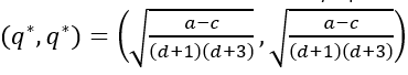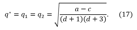 Proposición. El juego no cooperativo de Cournot (𝑁={1,2},{𝑆1=[0,+∞),𝑆2=[0,+∞)},{𝜋1,𝜋2}) con 𝜋1 y 𝜋2 dadas por las ecuaciones (4) - (5) y 0≤𝑑≤1, tiene un único equilibrio de Nash dado por la ecuación (17). Además, este equilibrio de Nash es simétrico.